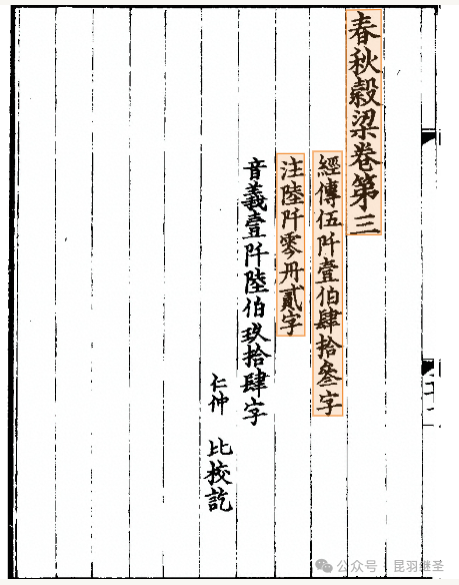 “春秋榖梁卷第三,经传伍阡壹伯肆拾叁字,注陆阡零丹贰字。”