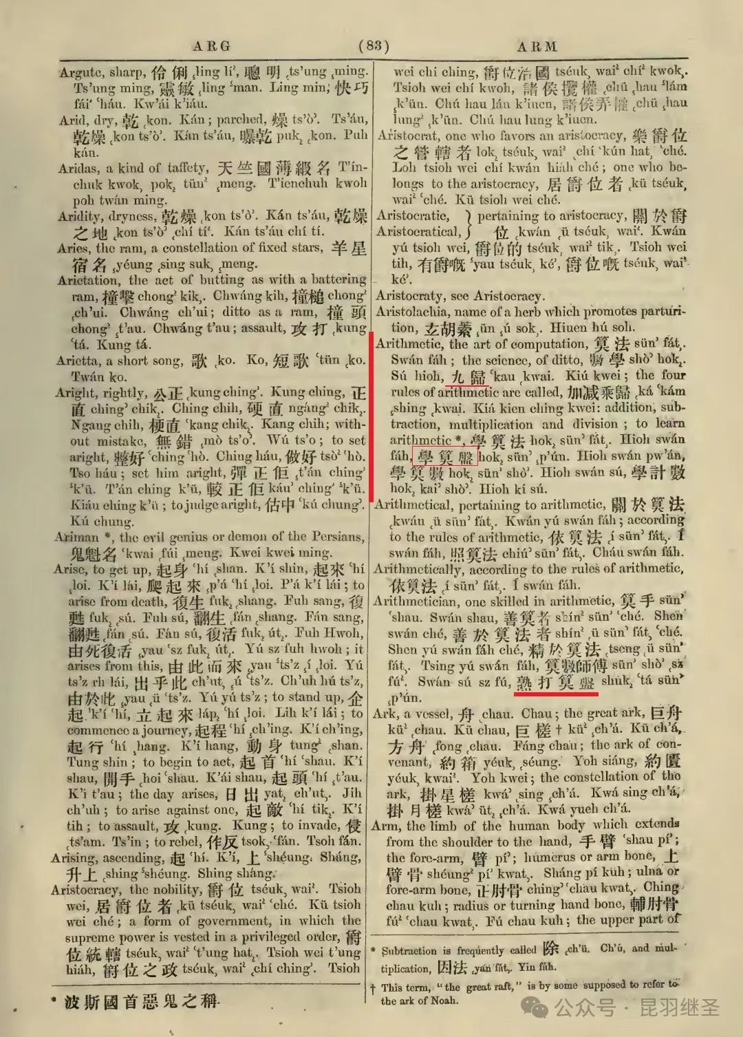 查阅1866年罗存德字典第83页,Arithmetic一词的含义除了“学算盘”外,还有“九归”。