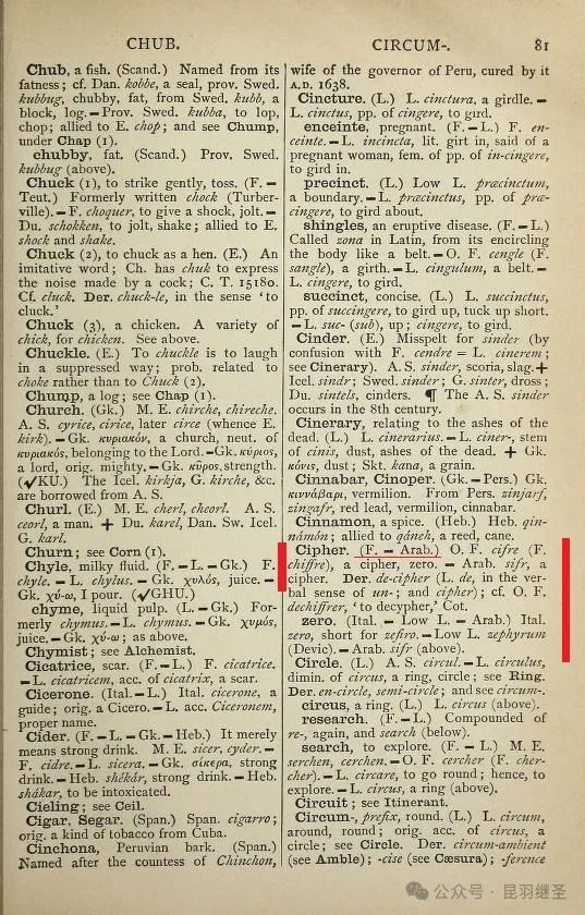 在该字典第81页中,Cipher(零)就失去了真正的华夏源头,而只能认彼时刚刚“出生”不久的“阿拉伯(Arab)”为父。