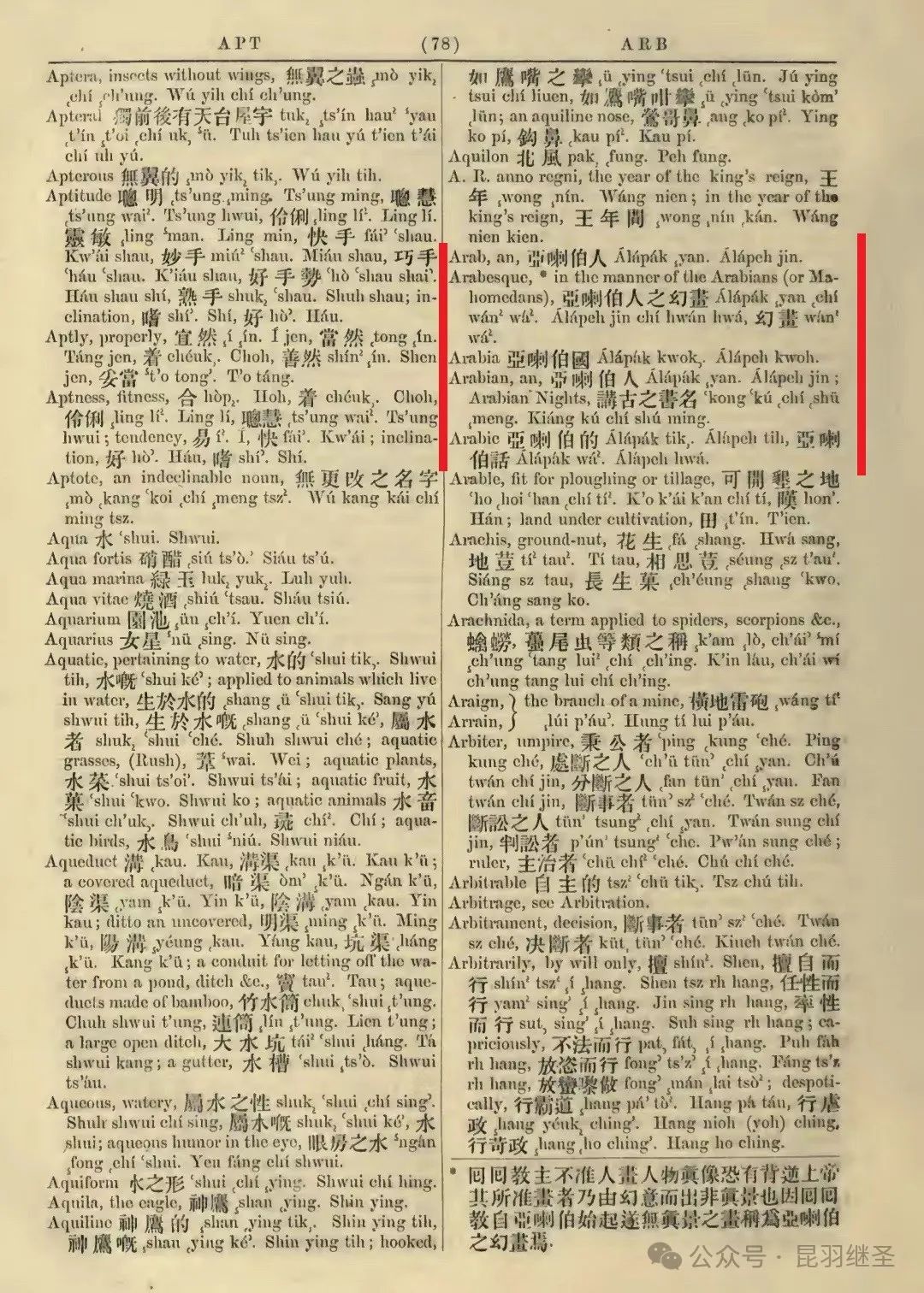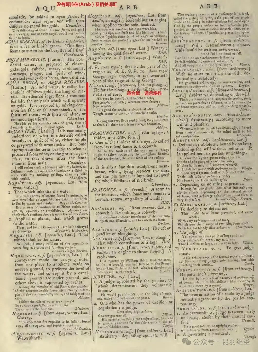 笔者查阅1816年威廉姆·恩菲尔德的《通用发音词典》第17页,找到了一个最初的解释。原来,彼时的Arabic,其含义为“a kind of gum”,即“一种树胶”!