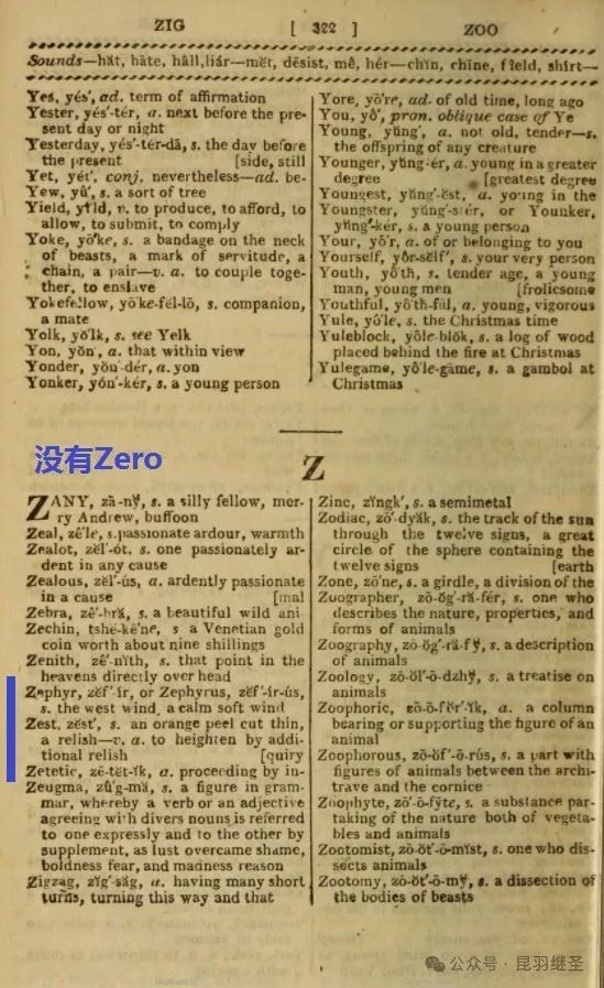 3)1816年威廉姆·恩菲尔德在伦敦出版的《通用发音词典》(《A General Pronoucing Dictionary)第322页,Zero一词尚未出现。