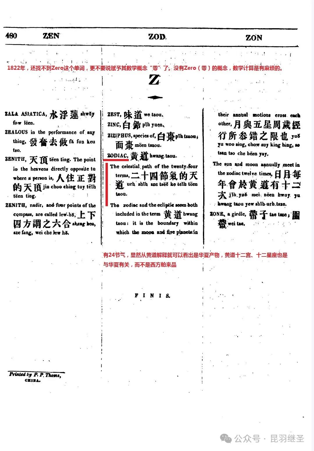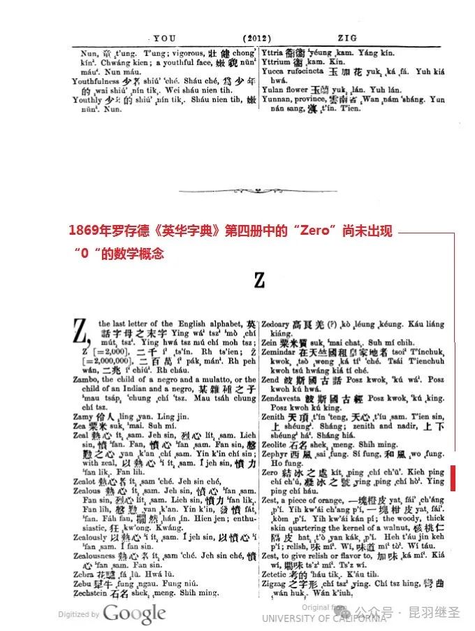 4)1822年马礼逊《华英字典》Z字部分(第480页)仅仅寥寥数个单词,还找不到Zero这个单词,更不要说赋予其数学概念“零”了。没有Zero(零)的概念,数学的基础计算都有大麻烦,更遑论发展高等数学了。