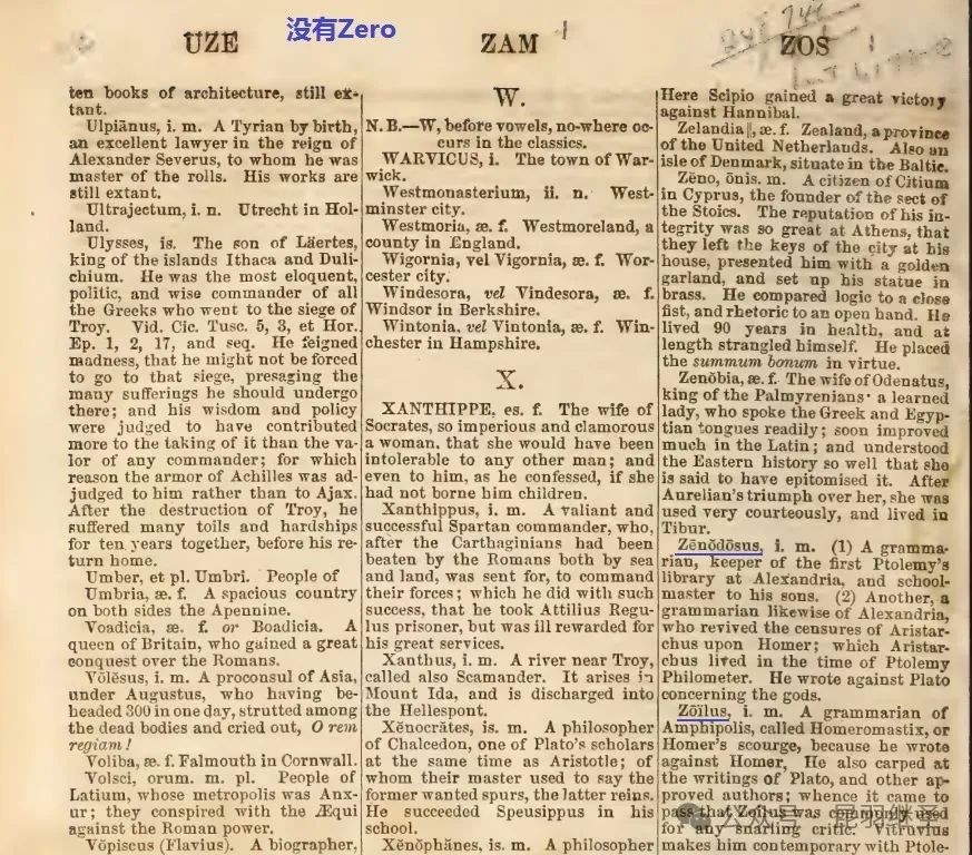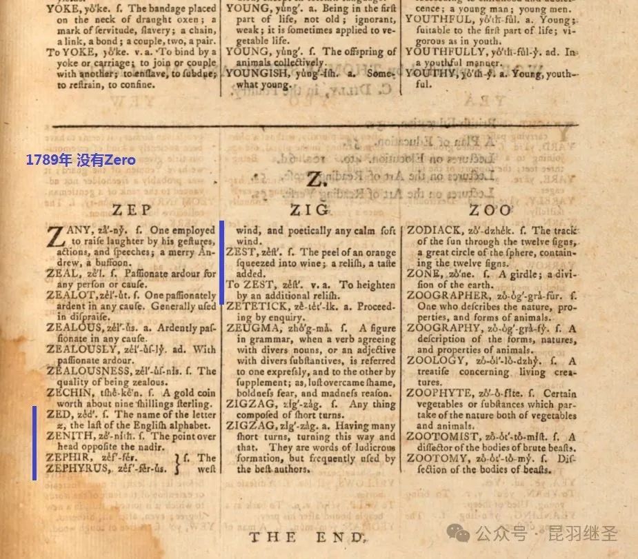 1)1789年托马斯·雪瑞登(Thomas Sheridan)的一本英语词典《A Complete Dictionary of the English Language》(第二版)关于字母Z部分,没有Zero一词。