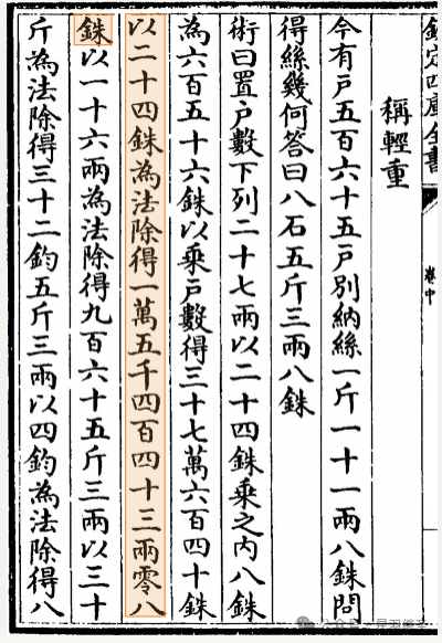 “以二十四铢为法,除得一万五千四百四十三两零八铢。”