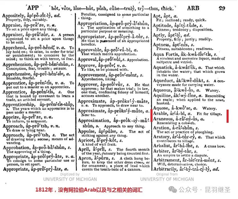 1812年,伦敦。有一位名叫斯蒂芬·琼斯(Stephen Jones)的人在雪瑞登的基础上出版了一本“升级版的英语字典”,名曰《英语通用发音解释词典》(《A General Pronouncing and Explanatory Dictionary of the English Language》),现藏于美国密歇根大学图书馆。该字典第29页,确认没有“阿拉伯”以及与之相关的词汇。