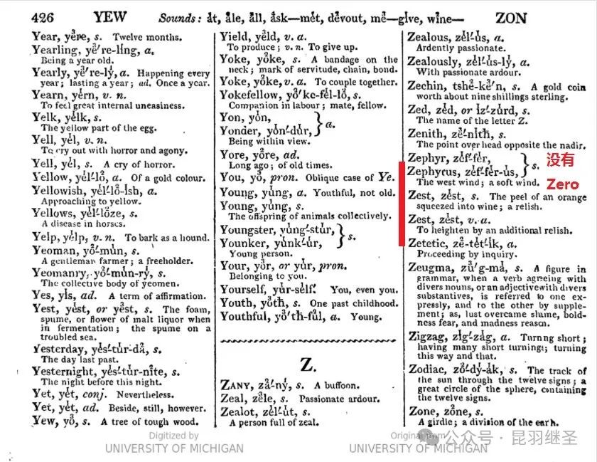 2)1812年斯蒂芬·琼斯《英语通用发音解释词典》(《A General Pronouncing and Explanatory Dictionary of the English Language》第426页中,没有Zero。