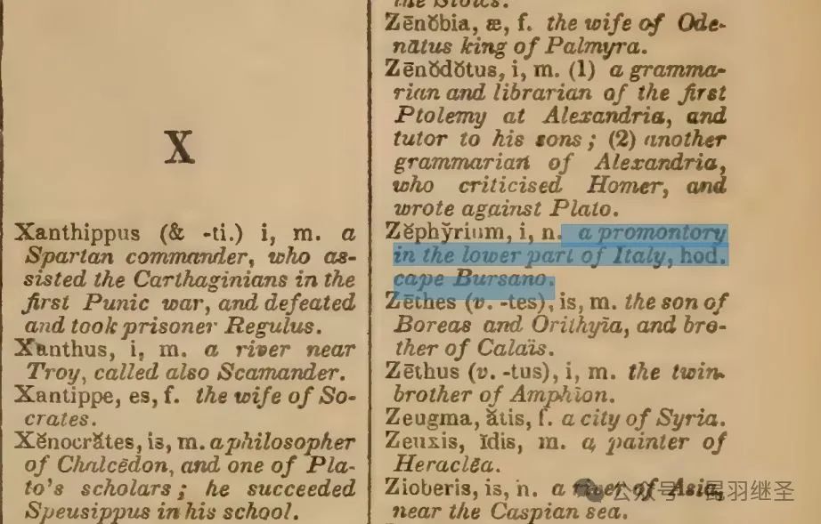 再查1836年新英拉简明字典《A new abridgment of Ainsworth’s dictionary,English and Latin》第405页,也没有拉丁语单词 Zephirum 或 Zephyrum,不过倒是出现了一个十分相近的单词 “Zephyrium”。那么,这个高度相似的“李鬼”是什么意思呢?