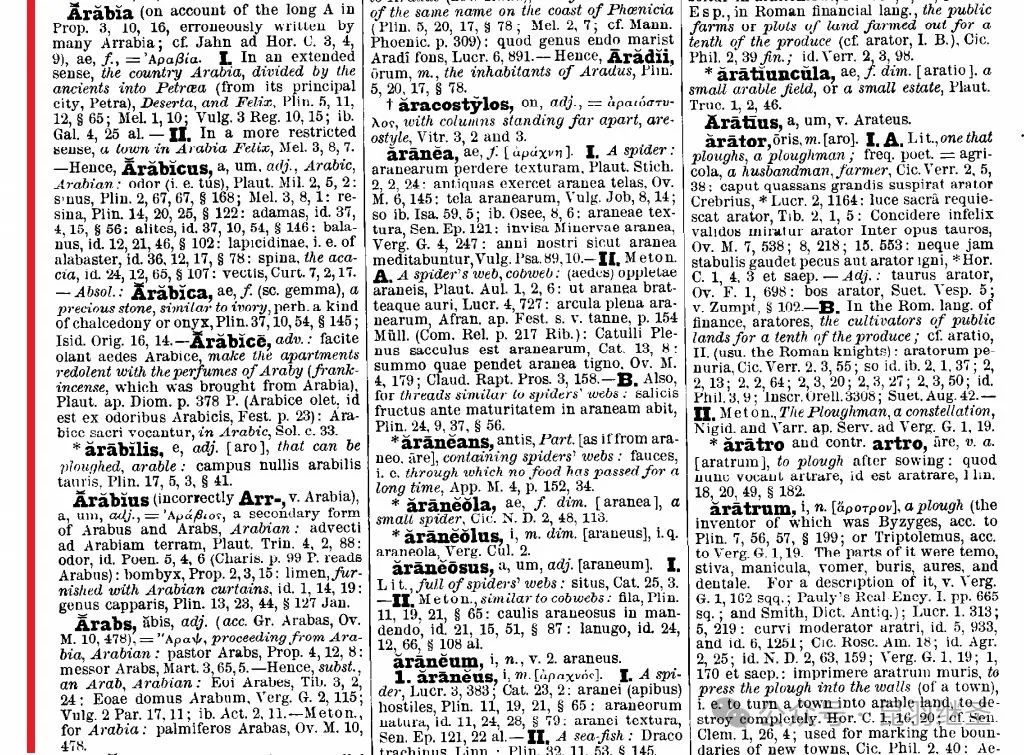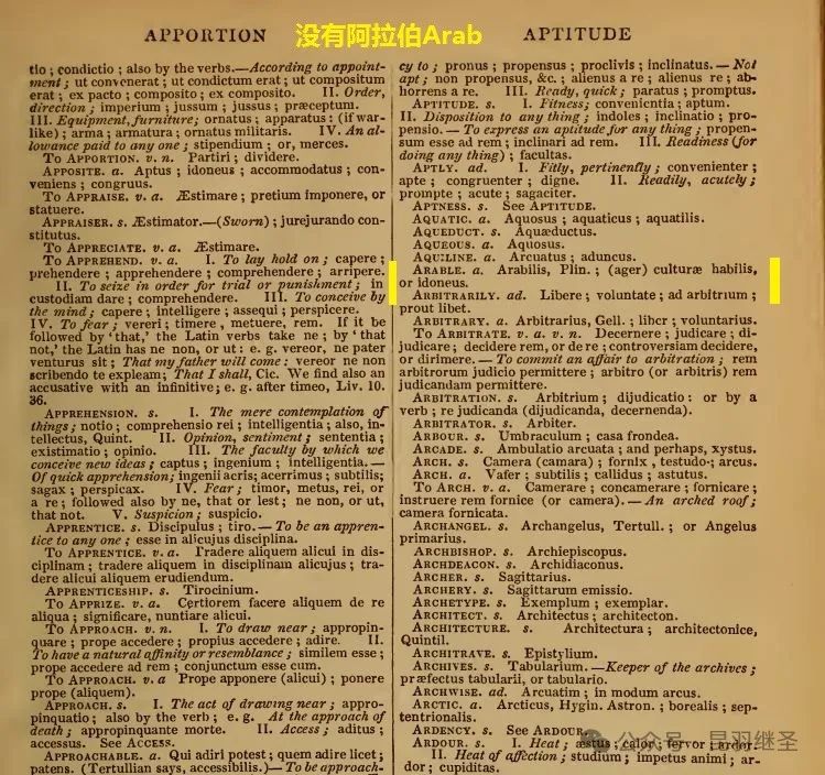 1843年的《英语拉丁语大词典》(A Complete English-Latin and Latin-English Dictionary)第三版中,也查不到阿拉伯(Arab)及其相关词汇。