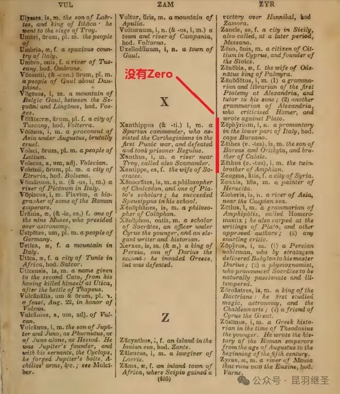 于是,笔者翻开了约翰迪莫克(John Dymock, LL.D.)于1836年在费城出版的一本《安斯沃思新英拉精简词典》(A New Abridgment of Ainsworth’s Dictionary, English and Latin)。在这本词典第405页,没有查到Zero这个单词。也就是说,1836年时,拉丁语中还没有诞生Zero这个词汇。那些拉丁语论文和专著中用Zero来表示“零”的概念的西方科学大神们,这下要露馅儿了。
