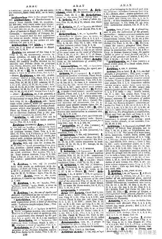 该字典第150页中,对阿拉伯的相关拉丁词汇Arabia、Arabs等等,则是大书特书,仿佛在向世人宣告:你看,阿拉伯的历史很悠久,解释很详细!