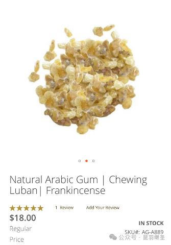这种所谓的阿拉伯树胶,也被称之为“frankincense”(乳香),这是一种从树上提炼的有甜味的树脂,是一种香料。点燃时散发出香味,尤用于宗教礼仪,可用于提炼乳香精油、乳香纯精油。