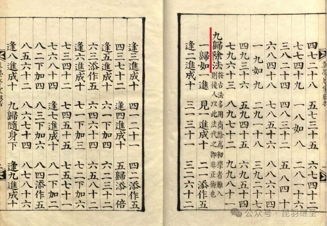 元代朱世杰所撰《新编算学启蒙》(清道光时期金正喜影写朝鲜刻本,三卷)第7页中便对“九归除法”有详细介绍。
