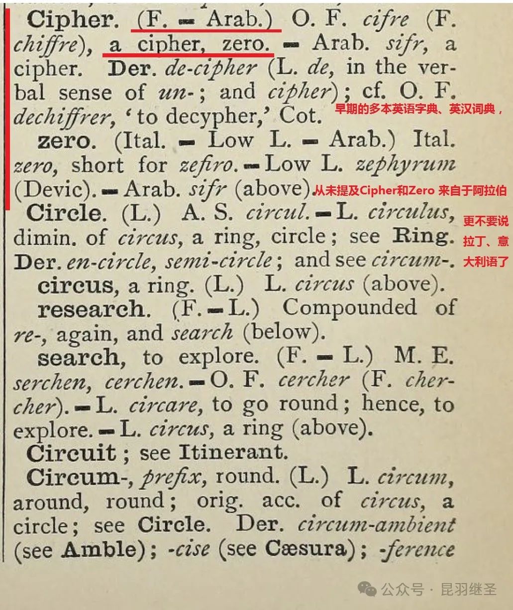 在1884年之前,早期的多本字典中,有关 Zero 和 Cipher的解释,何曾出现过“来源于阿拉伯”的字样?而且,通过笔者的考证,已经证明了Cipher 与华夏之间的紧密联系,而与所谓的阿拉伯无关。