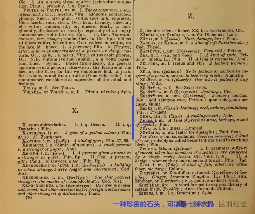 再查1843年《英语拉丁语大词典》(A Complete English-Latin and Latin-English Dictionary)第三版第754页,才刚刚出现了Zeros【非Zero】,但其解释为“一种珍贵的石头,可能是一种水晶(A kind of precious stone, perhaps, a sort of cystal)”,与Zero(零)的数学解释相去甚远。