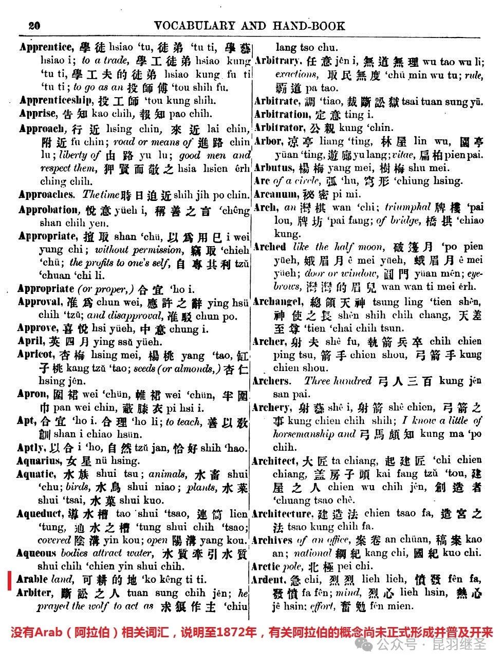 此时虽然罗存德创造出了阿拉伯的初始概念,但尚未普及开来,还未取得“公认”,为世人所接受。以致于到1872年时,仍旧有许多人并不知道“阿拉伯”的概念。这一点可以从1872年卢公明《英华萃林韵府》的收录情况看出来。在该字典第20页,没有Arab(阿拉伯)相关词汇。