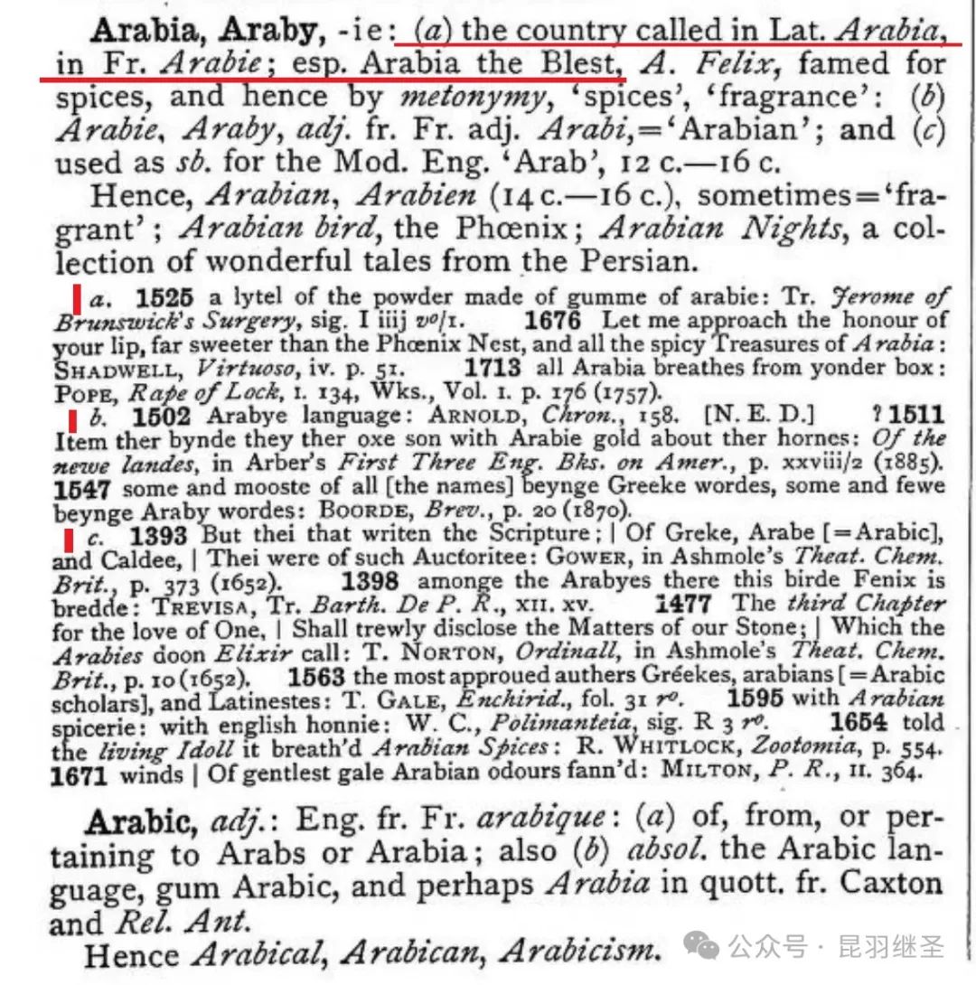 在这本字典中,西人宣称,Arabia是拉丁语中所称的一个国家,法语中将其称为Arabie。接着,又按年代来炮制历史,一直把历史前推至1393年,还与希腊人(Greke)扯在了一起,并在1547年时再次与古希腊(Greeke)“链接”在了一起。