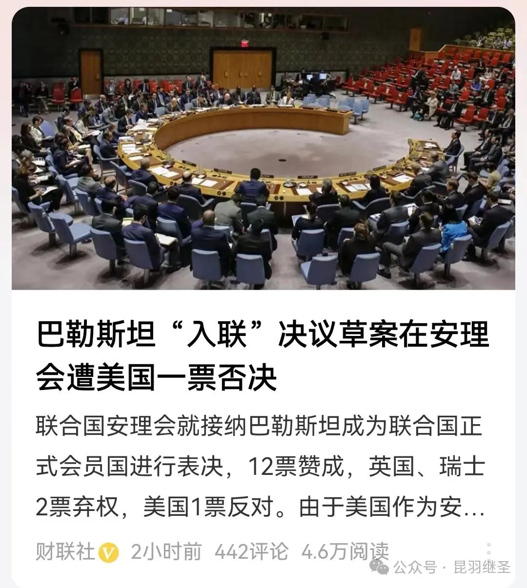 这一轮升级态势,第一个风向标信号就是美国对巴勒斯坦入联草案行使一票否决权。