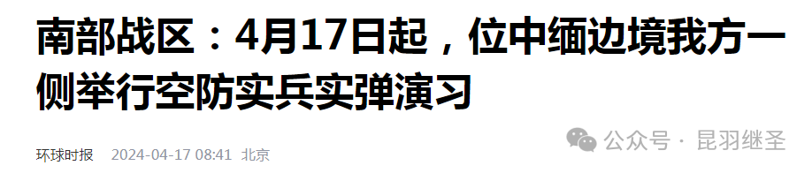 4月17日,南部战区发布消息,组织陆军、空军部队于4月17日起,位于中缅边境我方一侧举行空防实兵实弹演习,旨在检验战区部队侦察预警、立体封控、警示驱离、防空打击能力。战区部队时刻做好应对各类突发情况准备,坚决维护国家主权、边境稳定和人民生命财产安全。