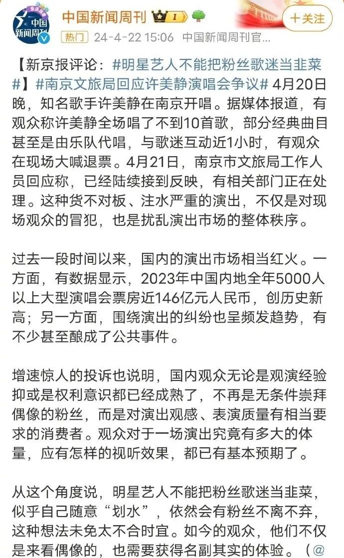 许美静如此直白的把歌迷当韭菜,自然引发歌迷的强烈不满,纷纷要求退票。