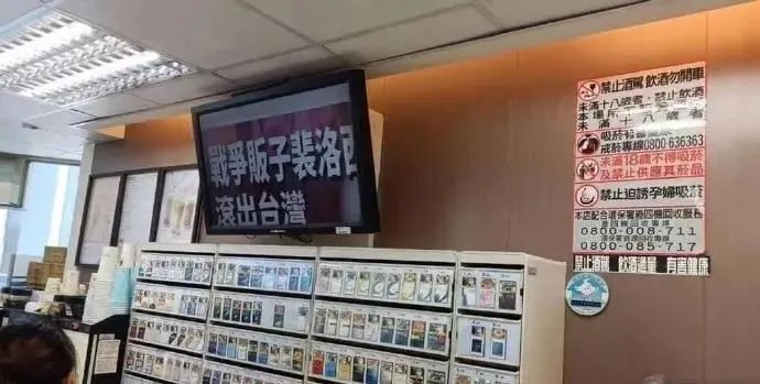 全岛多家7-11便利店门店的电视屏幕上,则显示了“战争贩子佩洛西滚出台湾”的宣传语。