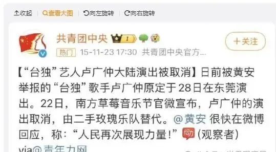 之后,卢广仲这个“台独”艺人不仅仅是在东莞的演出被取消,在大陆所有的演出均被取消。