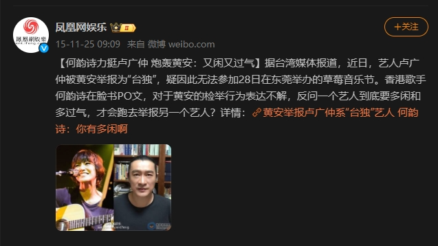 黄安公开举报“台独”艺人,还曾惹怒了“港独”艺人何韵诗、黄耀明和杜汶泽,遭受它们的攻击。