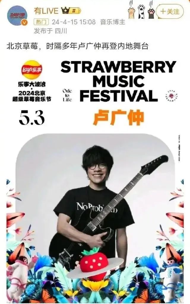 4曰15日某音乐博主透露卢广仲将登陆北京草莓音乐节。