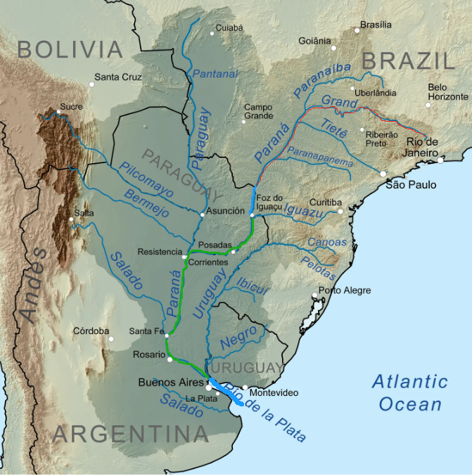 阿根廷确实也有大河,但其地形西部是高大的安第斯山,东部很快到大海,海拔急剧变化,水往低处流,从西往东快速注入大西洋,河流不可能从南向北贯穿国土。从巴西高原和玻利维亚高原来的巴拉那-拉普拉塔河全长4080公里,是世界第14长河流,水量五六名,世界最大的温带河流之一。
