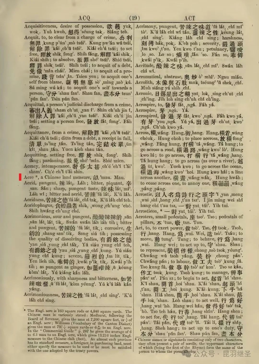 笔者查阅1866年罗存德《英华字典》,在第19页也找到了Acre这个单词,其解释为“亩”,并注明这是一种中国土地测量单位(A Chinese land measure)。