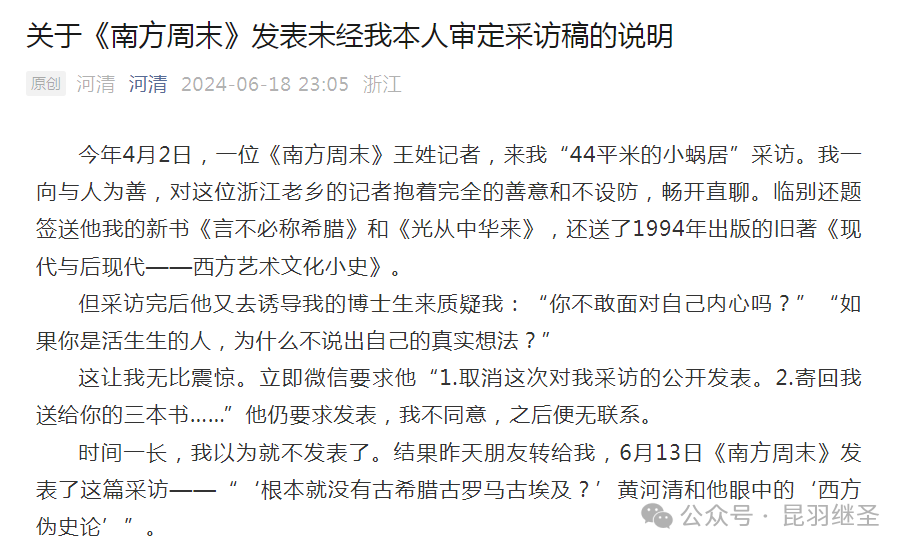 6月13日,南方周末发了一篇文章,题为《“根本就没有古希腊古罗马古埃及?”黄河清和他眼中的“西方伪史论”》。说实话,当时看到这篇文章的时候有点惊讶,不禁皱了皱眉,——南方周末怎么那么好心,跑去采访黄河清老师了?