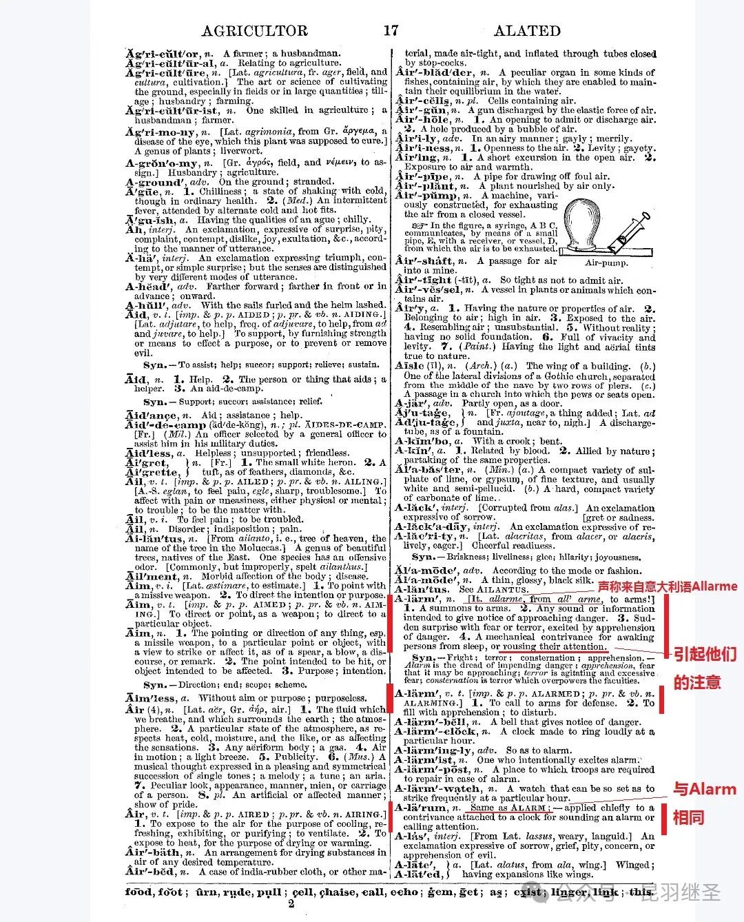 然而,这个Alarm却在1872年诺亚韦伯斯特的上述英语字典中被“堂而皇之”地标注为“来自意大利语”(It. allarme,from all arme,to arms!)