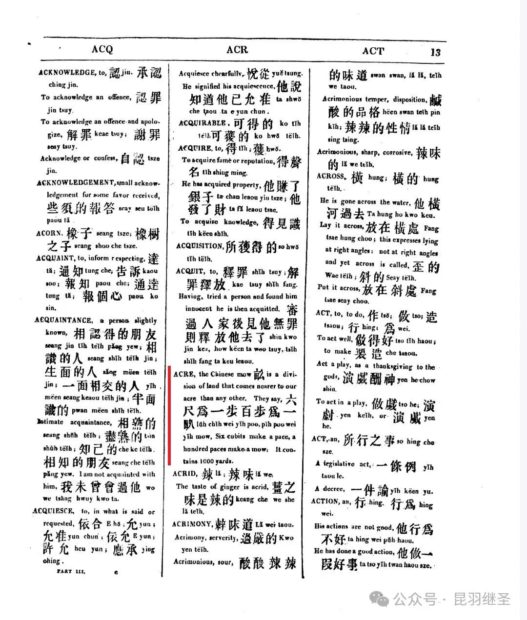 可是,在1822年马礼逊《华英字典》第13页,Acre的解释却白纸黑字写得清清楚楚:亩(the Chinese mow)。即中国的“亩”。而且还特别注明“六尺为一步,百步为一亩”。