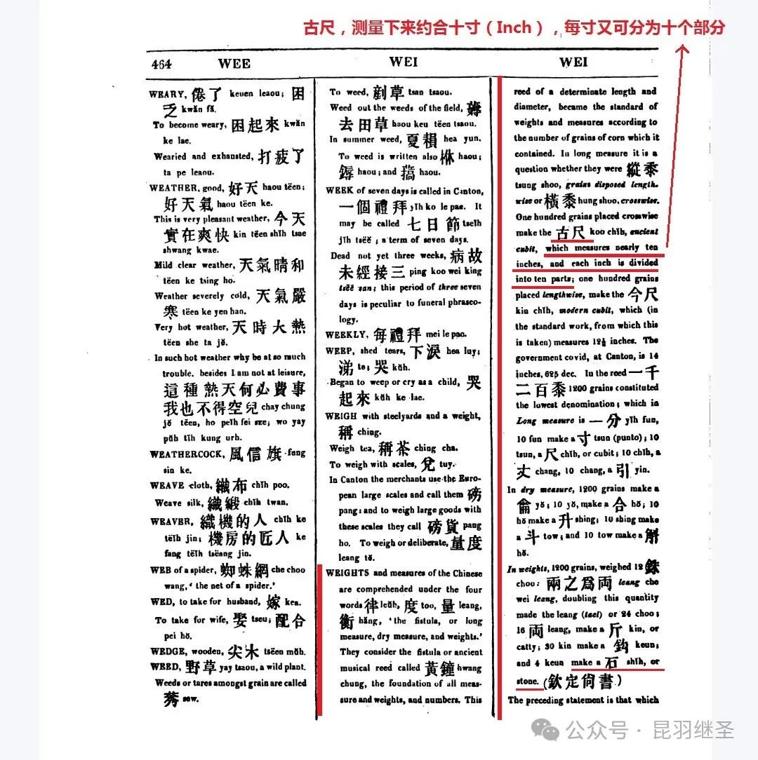 再来看看Weight部分的解释(1822年马礼逊《华英字典》第464页)。在这里,笔者发现了中国“古尺”,其英语描述为“which measures nearly ten inches,and each inch is divided into ten parts”,翻译过来大意便是“古尺测量下来约合十寸(inch),每寸又可分为十个部分”。