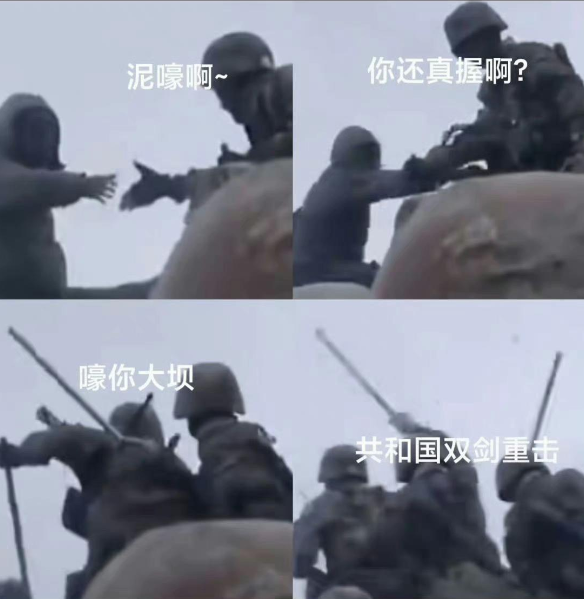 这个名场面导致中文词库诞生了一个新名词,叫以德斧人,和中国边防军在中印边境对印军的礼仪之邦,邦邦邦一样出名。