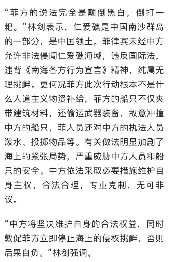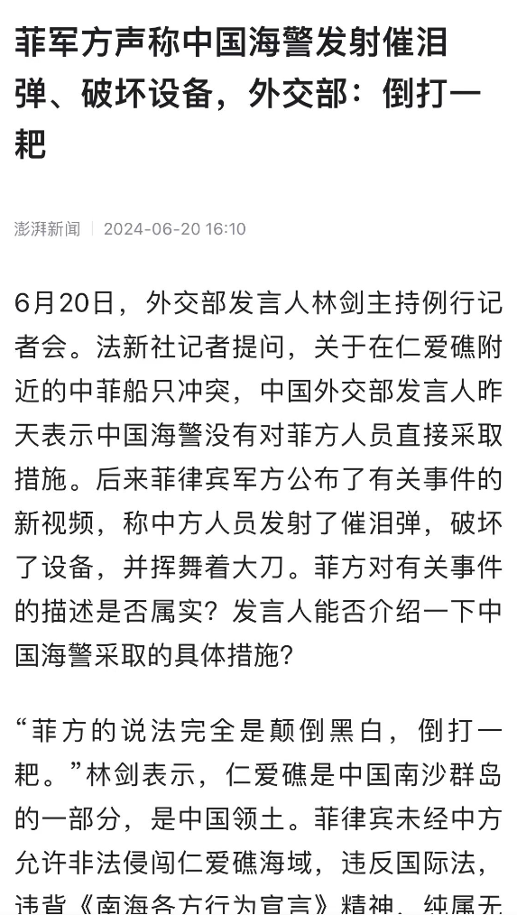 对于菲律宾官方的其他说法,比如发射催泪弹啊,砍碎驾驶舱和手机,夺取枪支等等指控,中国外交部发言人给出了官方回应,菲方说法完全是颠倒黑白,倒打一耙。