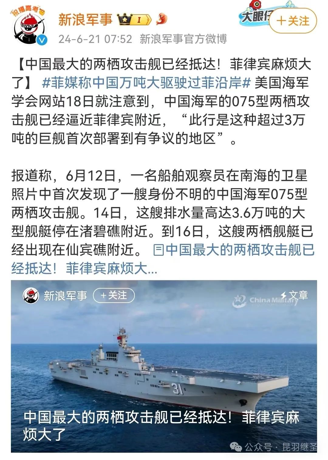 6月21日,新浪军事发布消息称,中国海军的075型两栖攻击舰已经逼近菲律宾,这是排水量高达3.6万吨的海上巨舰首次部署到南海。