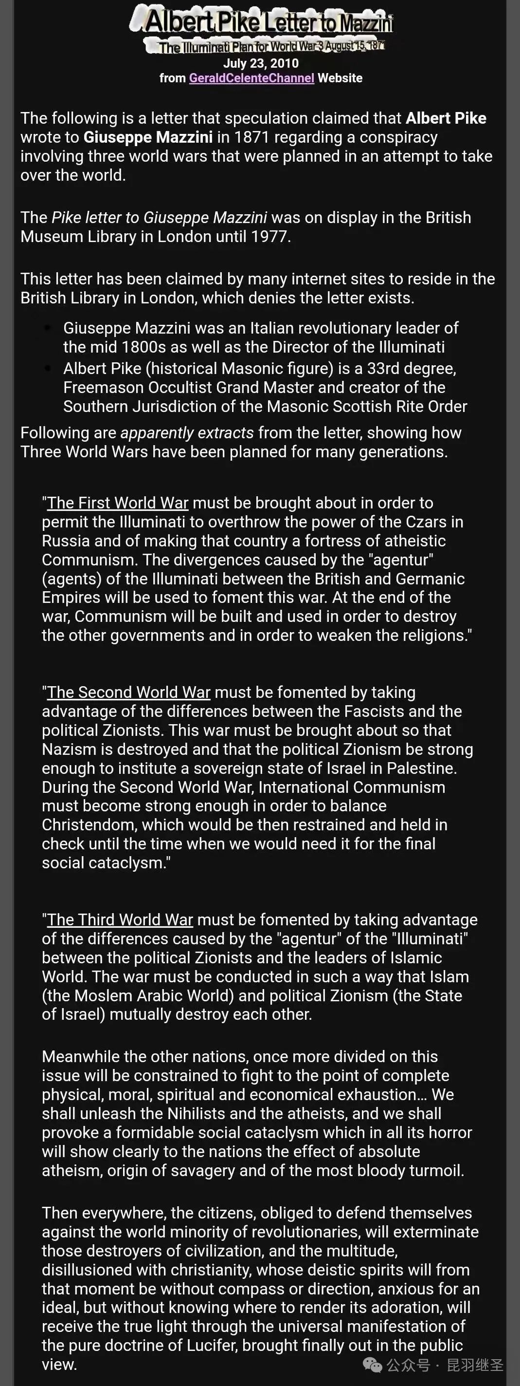 在过去几十年里,网上一直流传着一封由派克写给另一名共济会会员朱塞佩•马志尼(Giuseppe Mazziini)的信。信中称,未来将会发生三次世界大战。据记载,这封信在1925年由大英博物馆图书馆收藏,但大英博物馆对此却极力否认。即使今天没有充分无证来证实此信的存在,但信件流传的内容,却与过去一百年的历史演变颇为吻合。