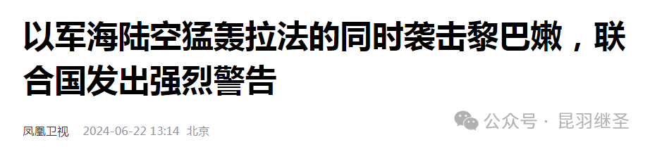 6月21日,以色列在美军的支持下,对加沙多地展开袭击,造成至少45人死亡,其中有多个帐篷营地遭到袭击。以军据报从海陆空三路夹击拉法,加沙民众表示,似乎以军是要全面占据拉法。另一方面,以军向黎巴嫩边境村庄施袭,造成严重破坏,伊朗警告,以色列任何轻率的决定,会让地区陷入一场新的战争。联合国秘书长古特雷斯21日表示,对以色列和黎巴嫩真主党敌对行动升级深表关注,他警告称,中东冲突扩大的风险真实存在,世界无法承受黎巴嫩成为另一个加沙。