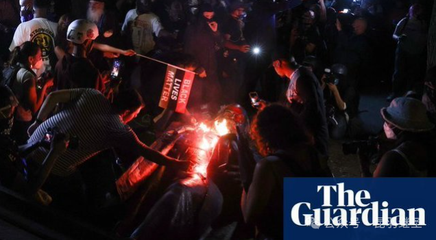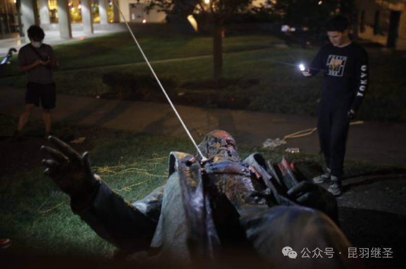 2020年6月19日晚,美国华盛顿。抗议者们围在南军将军亚伯特·派克的雕像周围,用了一个小时的时间,将雕像拉倒,此后点火焚烧。
