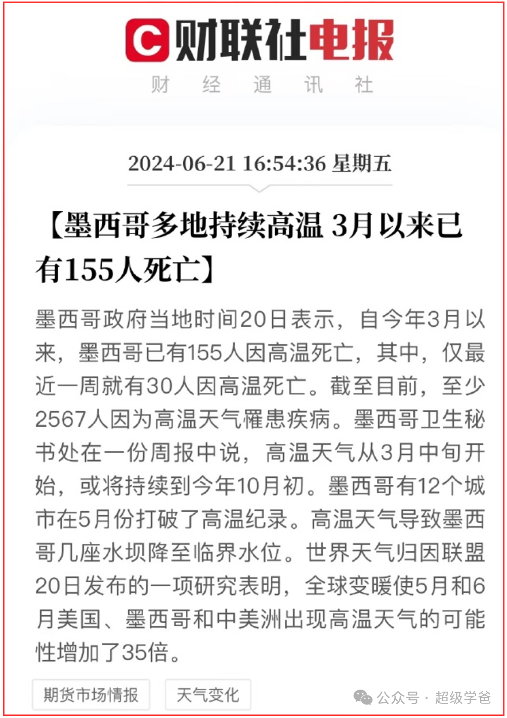 墨西哥也正在经历一场空前的高温和干旱。自今年3月以来,墨西哥已经有155人因高温死亡。墨西哥有12座城市在5月打破了高温纪录,墨西哥的几座水坝已经降至临界水位。