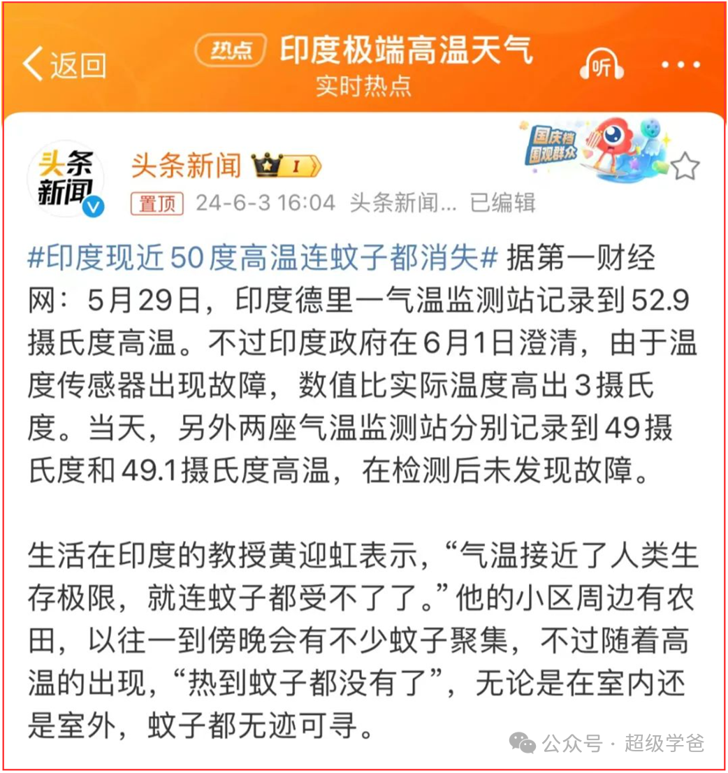 更夸张的是印度的北方邦、比哈尔邦等地,最高气温长期盘踞在50度左右,夜里最低气温也在40度上下。由于温度过高,连蚊子都没了。