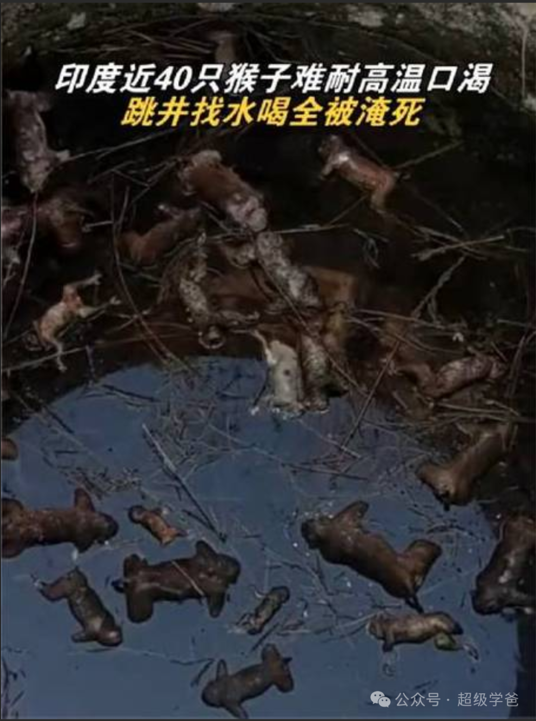 人还好办一点,那些常年穿着毛皮大衣的动物们就更倒霉了。印度的贾坎德邦东部的帕拉穆地区,村民发现近40只猴子淹死在一口井里。