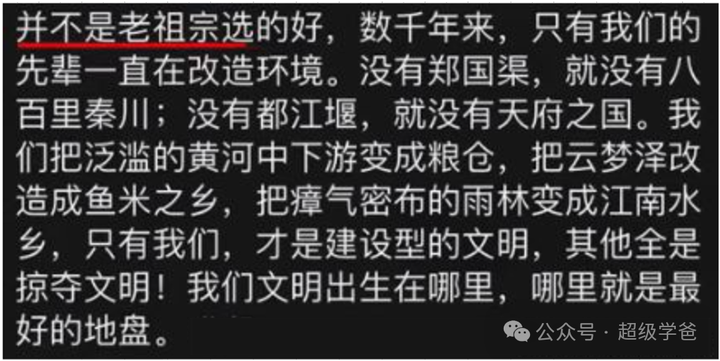 最后他得出结论:只有我们(中华文明),才是建设型的文明,其他全是掠夺型的文明。我们的文明出生在哪里,哪里就是最好的地盘。