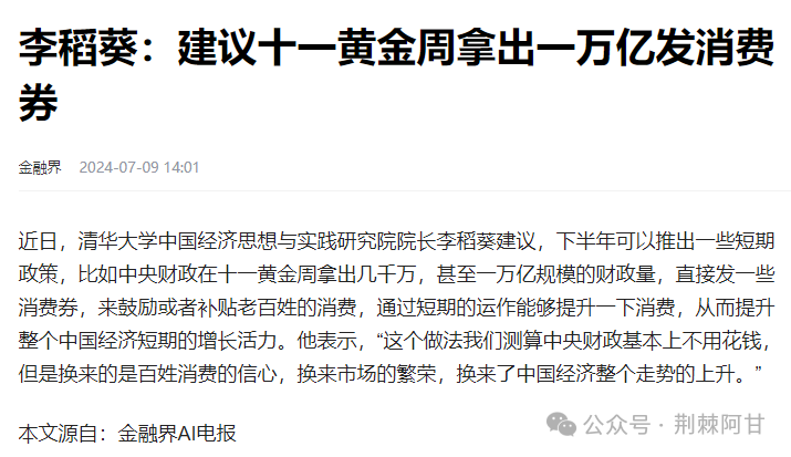 关键是就业,不是发钱 2024年7月12日 上午12:38 • 未分类 好久没有写国内经济了,不是不想写,而是不好写,所以现在国内的一些事情只能在星球写。 昨天,我看到一个新闻: 李稻葵院长的这个建议出发点是好的,但是实际效果不会很好,因为没有从根源上解决问题。 现在经济问题的根源是什么? 是内需不振?不对,这个是结果,不是原因。 是房地产萎靡?也不对,这个也是结果,不是原因。 真正的原因是就业不足。 这些年又是电商,又是产业升级,导致制造业就业人口下滑,服务业就业人口也下滑。 就业的人数下滑,导致劳动力市场内卷,导致消费力不足,导致年轻人不敢买房,不敢结婚。 没有工作,无论怎么刺激,都无法提振消费。 这几年全国各路陆续发放消费券,但是内需始终提振不起来;出台各种刺激买房的政策,可是年轻人不买房。 很多人说年轻人躺平了,思想上没有冲劲,这其实错怪了年轻人。 为何? 因为年轻人的失业率实在太高了,年轻人是消费的主力军,而现在年轻人失业率这么高,他们怎么结婚,怎么买房,怎么消费呢? ▶一个工资3000的年轻人,你不刺激他,他也会去买个3000的手机; ▶一个没有工作的年轻人,3000的手机国家补贴500块,他会买吗? 李稻葵院长说拿出1万亿刺激消费,这就是花大钱办小事。我们换一个方法,刺激就业呢? 如果此时中央财政出台政策,每个新增就业人口补贴1000块,全国500万个名额,先到先得,补贴1年,总开销是多少? 1000元/月*500万人*12月/人/年=600亿。 这么做的好处很多: ▶第一,促进区域均衡发展。 1000元的补贴对沿海的人没什么帮助,但是内地很多地方工资才两三千,给他们补贴1000块帮助很大。如此一来,吸引了很多人回内地工作,促进了区域均衡。 ▶第二,能在很短时间把失业率下降很多。 几个月时间增加500万人的就业,失业率会下滑接近1个百分点。这500万人就业以后,提振消费,实际带来的就业会更多。 ▶第三,花的钱很少,一年才600亿而已,这个钱丢到房地产市场,丢到消费补贴市场,水泡都起不来一个。 ▶第四,500万人有了工作,他们就可以增加消费,他们安定下来,就可以结婚,生孩子。 1年花12000块的补贴,让内地企业招聘一个月薪3000的年轻人,他有可能会买一个30万的房子,也就是花1.2万,带来的消费可能是30万,这个刺激政策把终端消费放大了20多倍。 ▶第五,增加储备力量。 现在很多企业要出海,出海就要人,完全可以提前招聘一些储备人才,如果国家能给一些补贴,很多企业就更加有动机。 未来在海外的工厂建立了,可以让储备人才出去轮换,这对国家出海大政策也有帮助。 ▶第六,没有后遗症。 这是短期刺激政策,刺激一年也就600亿,就算刺激2年也才1200亿,等到后面经济形势好转了,年轻人的失业率下滑到10%以内,就可以把这个政策逐步取消,没什么副作用。 中央财政一年总收入21万亿,拿出几百上千亿,完全就是九牛一毛,对整个财政平衡几乎没有什么影响。 很多人说全民发钱,这完全就是昏招,花很大的钱,办很小的事,对财政是大负担,又解决不了很实际的问题,刺激不了消费的,因为有钱人拿到钱就存银行,没钱人拿到钱也只是解决短期问题。 把房地产和消费卷那些补贴的一半,甚至是1/3给到补贴就业,几个月之后会发现所有经济问题全部解决。 解决就业,釜底抽薪;其他的措施都是扬汤止沸。 其实还有其他办法解决就业,都是花小钱,办大事,副作用少,见效快的。 结束 请关注并点赞+在看。你的每一次点赞都是我创作路上的动力来源。 免责声明:本文由荆棘阿甘原创创作,图片来源网络,如有侵权请联系告知。 点个在看你最好看 1、本文只代表作者个人观点,不代表星火智库立场,仅供大家学习参考; 2、如若转载,请注明出处:https://www.xinghuozhiku.com/440674.html Like (4) 0 0 Generate poster 油罐车妖雾迷漫,拨开乌云见晴天 Previous 2024年7月12日 上午12:38 越南摸中国过河,却在溺水中喊救命 Next 2024年7月14日 上午2:27 相关推荐 福建舰又一次出人意料,8万吨巨舰突然出海,目的地已经变了 2024年5月29日 能制造“超强力放射性海啸”,朝鲜首次公开这种神秘核武器 2023年3月25日 日本军费十连涨,想干什么? 2021年9月8日 刚刚,航母又被打了,帝国犯了超级大错 2024年6月3日 德州起兵!美国的剧本突然快进到了内战的边缘 2024年1月29日 为什么说大唐灭亡始于八百桂林戍卒哗变? 2023年9月14日 延续半个世纪的阴谋,日本重回军国主义道路? 2022年5月14日 日本,坐不住了 2022年4月15日 发表回复 You must be logged in to post a comment...Please Login to Comment 提交