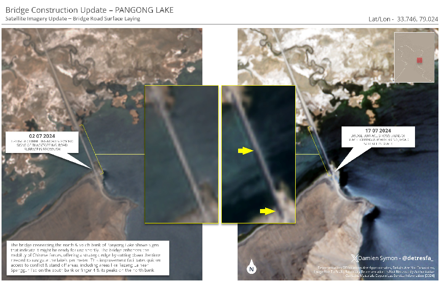 原因很简单,印军长期关注班公湖南岸地带,没有在班公湖北岸地带站稳脚跟,但目前态势却对印军前出拥有一定优势。反观解放军则持续经营班公湖北岸地带,出兵南岸地带时就需要绕很大一圈,从而使得解放军在维护边境主权时处于劣势,所以从2020年6月过后,中国便着手在班公湖地区开始修建第一座公路大桥。
