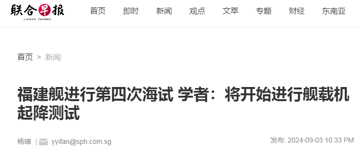 新加坡《联合早报》3日称,在港口短暂停留约1个月的中国海军第三艘航母福建舰当天驶出长江口,开始第四次海试。