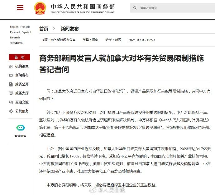 但是9月3日,中国针对加拿大发起了全球首例的“反歧视”贸易调查。