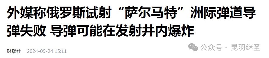 大俄方面,据财联社2024年9月24日电,多家外媒9月23日根据卫星图像推断,俄罗斯本月试射“萨尔马特”洲际弹道导弹失败,导弹可能在发射井内爆炸。“萨尔马特”导弹重量超200吨,射程可达1.8万公里,可搭载包括高超音速弹头在内的多种核弹头。这是“萨尔马特”过去两年间至少第二次试射失败。