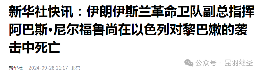 从9月28日新华社发布的快讯“伊朗伊斯兰革命卫队副总指挥阿巴斯·尼尔福鲁尚在以色列对黎巴嫩的袭击中死亡”的消息来看,《巴黎人报》的这条信息是确切的。