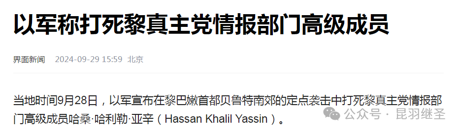 “作为该地区(武装组织中)最具代表性的阿拉伯领导人物,他的死亡意味着以色列和伊朗未来在黎巴嫩乃至整个黎凡特(Levant,广义上包括黎巴嫩、巴勒斯坦、约旦、以色列、伊拉克等意大利以东地中海区域)的正面对抗拉开序幕。”